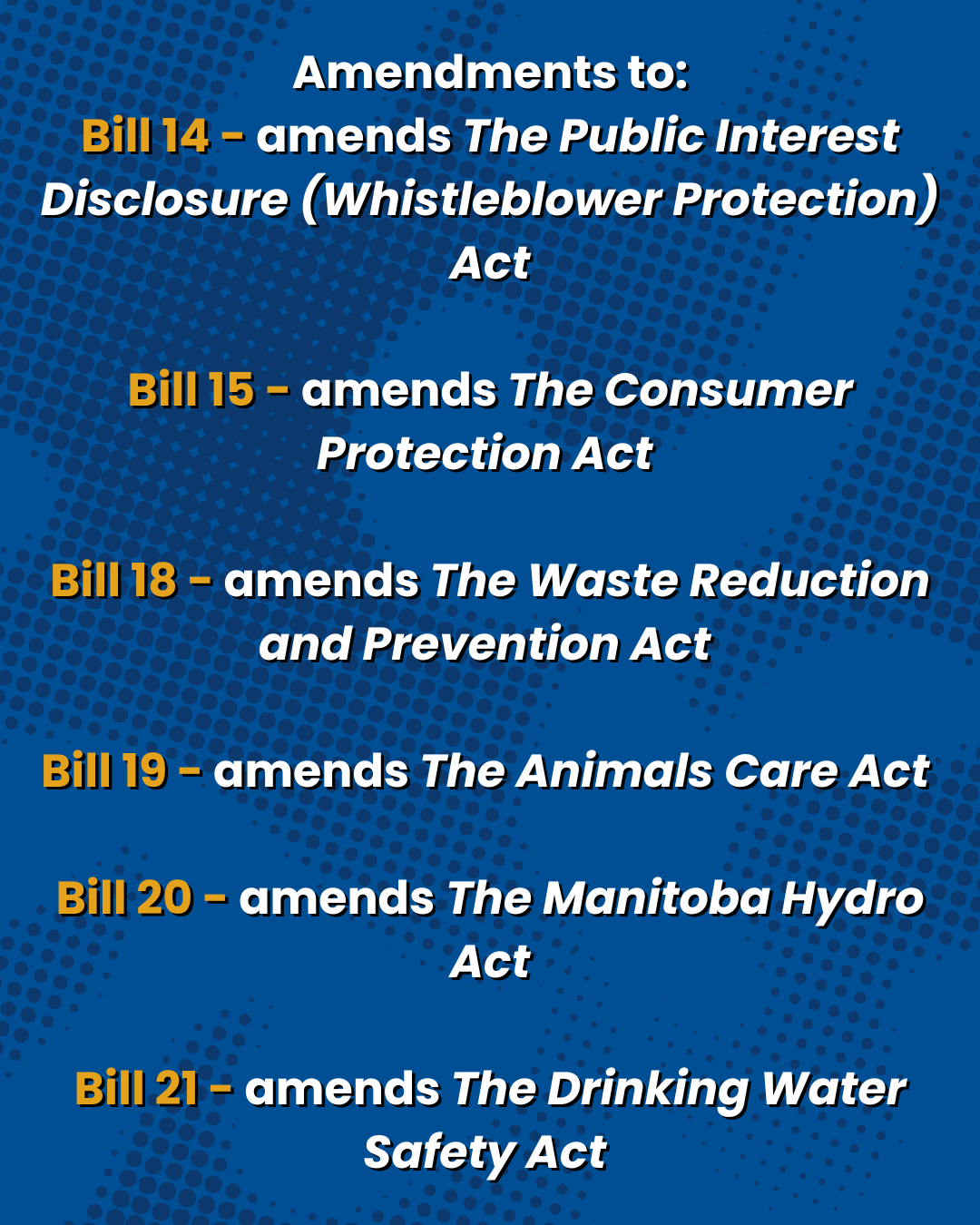 - Bill 14 – amends The Public Interest Disclosure (Whistleblower Protection) Act to enhance protection when allegations involve senior officials.