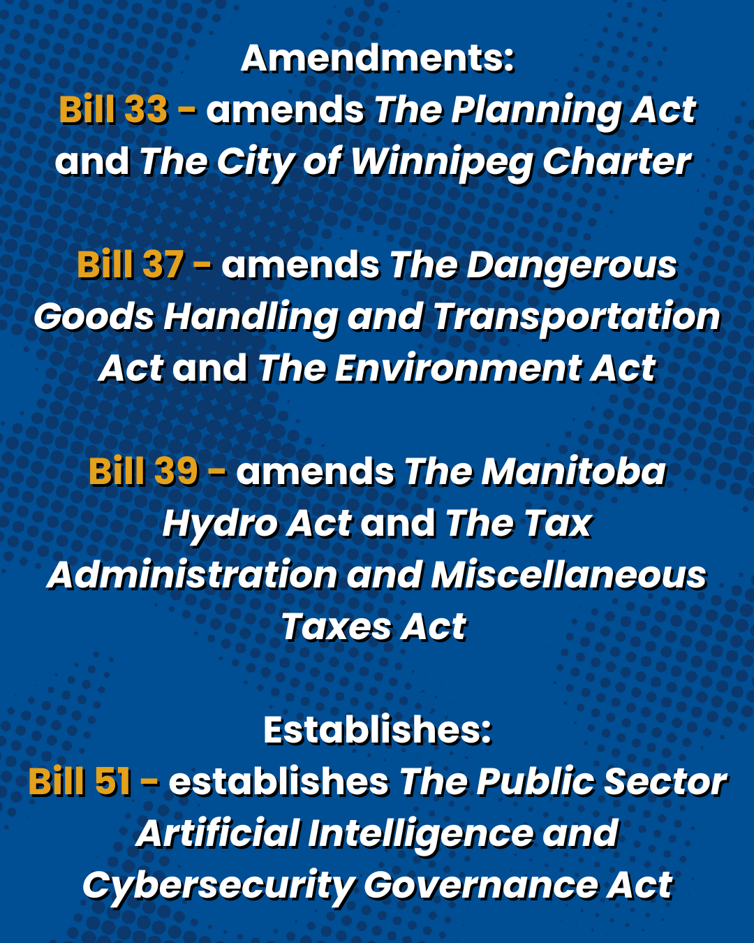 - Bill 51 – establishes The Public Sector Artificial Intelligence and Cybersecurity Governance Act which enables the establishment of regulations for public sector entities (such as the government, a government agency, a health authority, a university, a school division or a municipality) with respect to the use of artificial intelligence systems and cybersecurity.