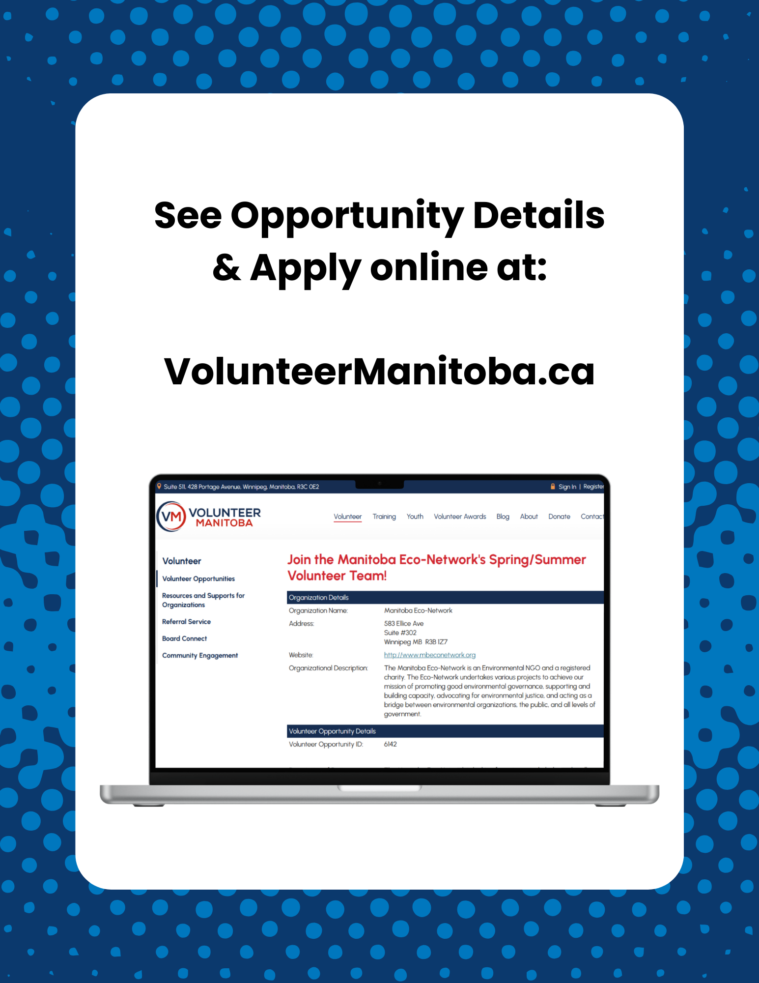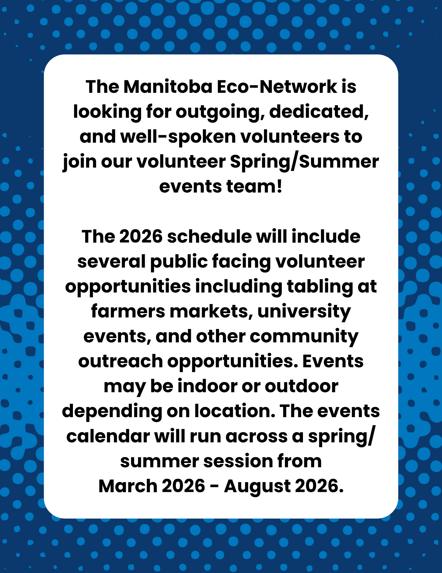 The Manitoba Eco-Network is looking for outgoing, dedicated, and well-spoken volunteers to join our volunteer Spring/Summer events team!